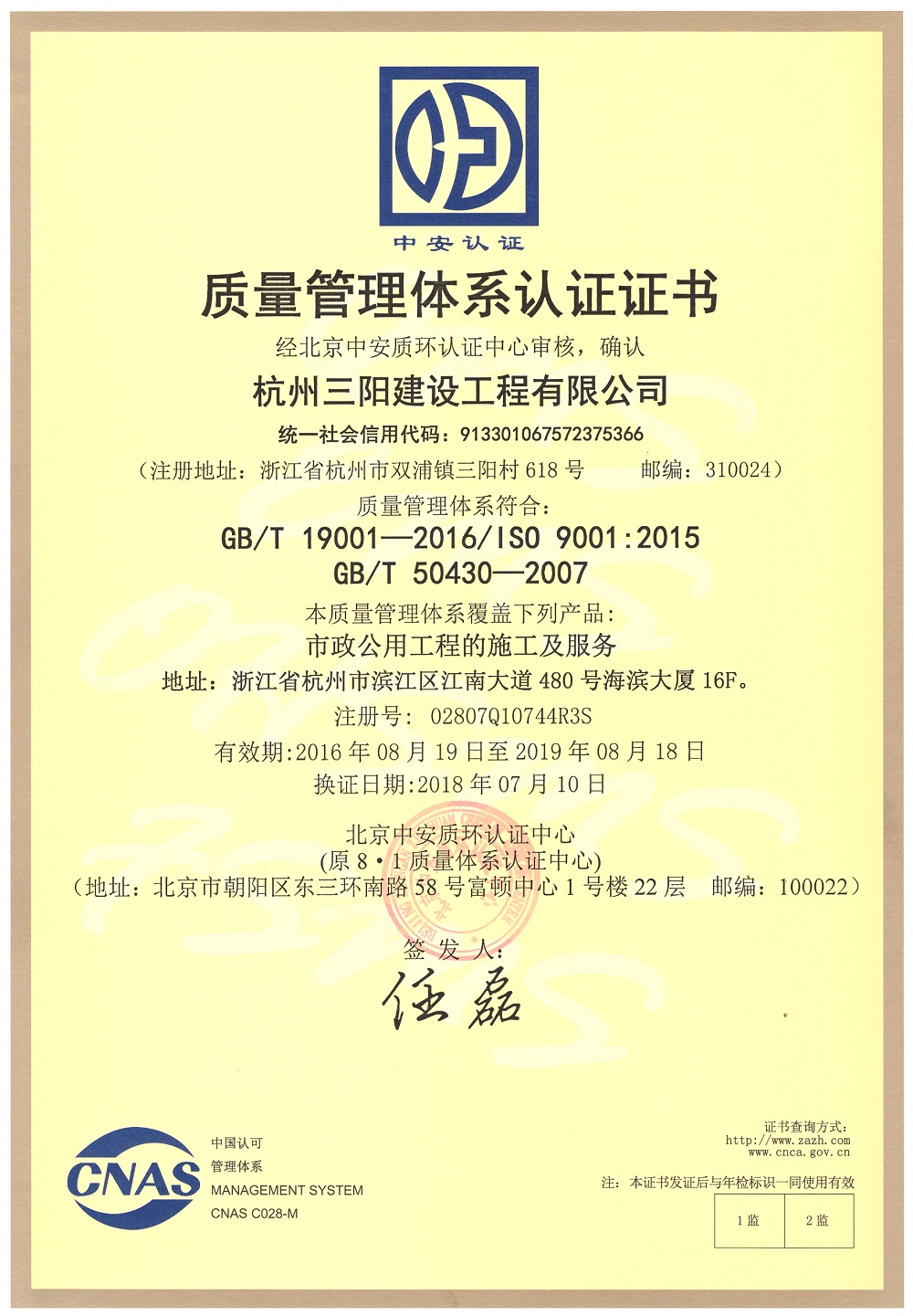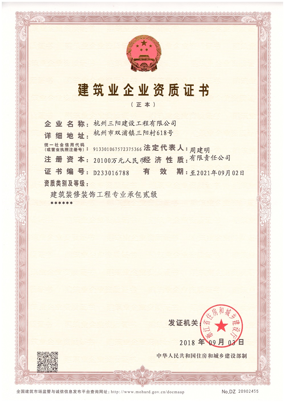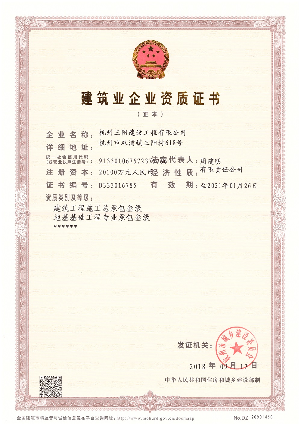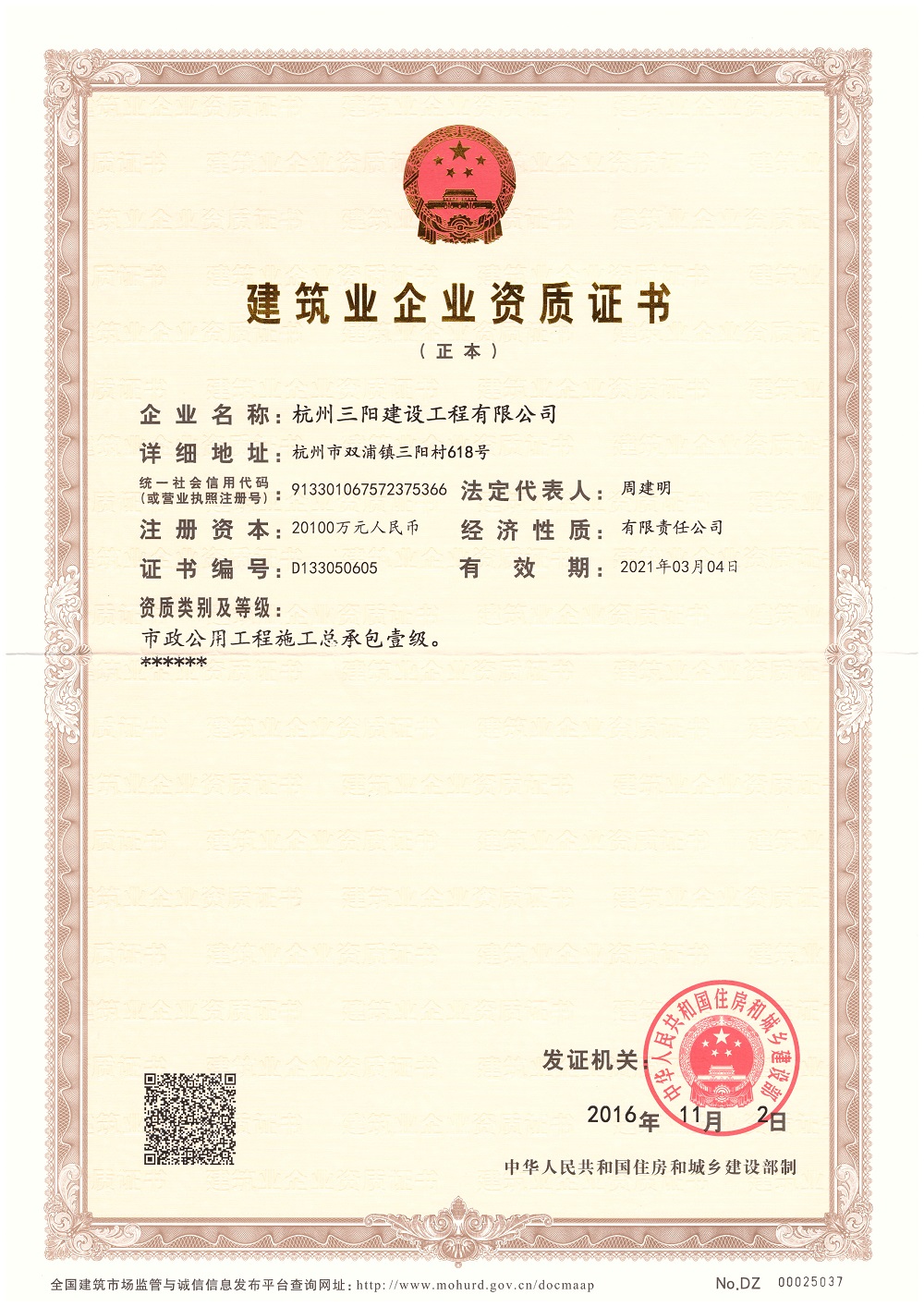 公司具有市政公用工程總承包壹級(jí)、建筑裝飾裝修工程設(shè)計(jì)與施工貳級(jí)、建筑裝飾裝修,房屋建筑施工總承包、城市園林綠化、土石方專(zhuān)業(yè)承包資質(zhì),榮獲“蕭山區(qū)市政公用施工企業(yè)信用等級(jí)評(píng)價(jià)優(yōu)秀企業(yè)”、“浙江省工商企業(yè)信用AA級(jí)‘守合同重信用’單位”、杭州市“西湖杯”等榮譽(yù)。連續(xù)多年被杭州市人民政府授權(quán)為AAA級(jí)企業(yè),并被杭州聯(lián)合銀行等多個(gè)銀行機(jī)構(gòu)多次評(píng)選為“最佳合作伙伴”,“優(yōu)質(zhì)客戶” “重合同、守信用單位”。連續(xù)四年入選市政府承包商名錄。