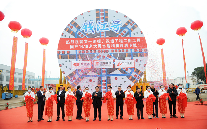 下線儀式上,公司代表陳涌彪、鄭放;業主代表陸明忠;監理代表占錦堂;基地代表匡治國及出租方代表呂春雷、孫志強、張猛等諸位領導為文一路提升改造工程二期工程國產14.16米“錢江號”大泥水盾構機下線剪彩。參加本次下線儀式的還有公司文一路項目經理高煒亮,業主代表、監理代表、該項目盾構專家、盾構負責人等。