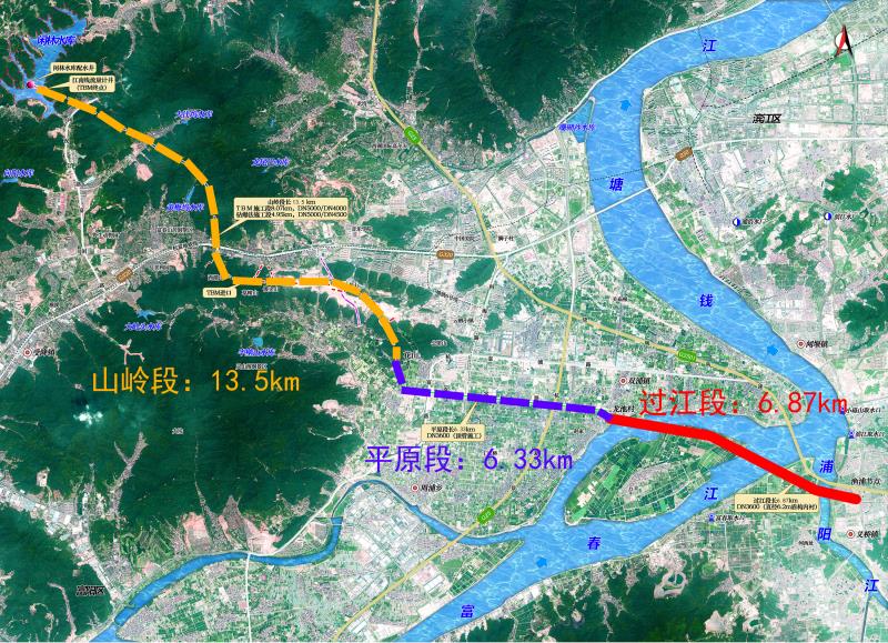杭州市第二水源輸水通道工程江南線設計輸水規模為200萬m3/d,能滿足江南片2040年規劃水平年約70%的應急備用需求。江南線輸水線路全長約26.13km,根據項目實施安排,江南線分山嶺段、平原管道段和穿江段,千島湖配水工程閑林取水口配水井至花山為山嶺段,長約13.13km,花山至雙浦節點段為平原段,管道長約6.22km,雙浦節點至漁浦為過江段,管道長約6.87km。