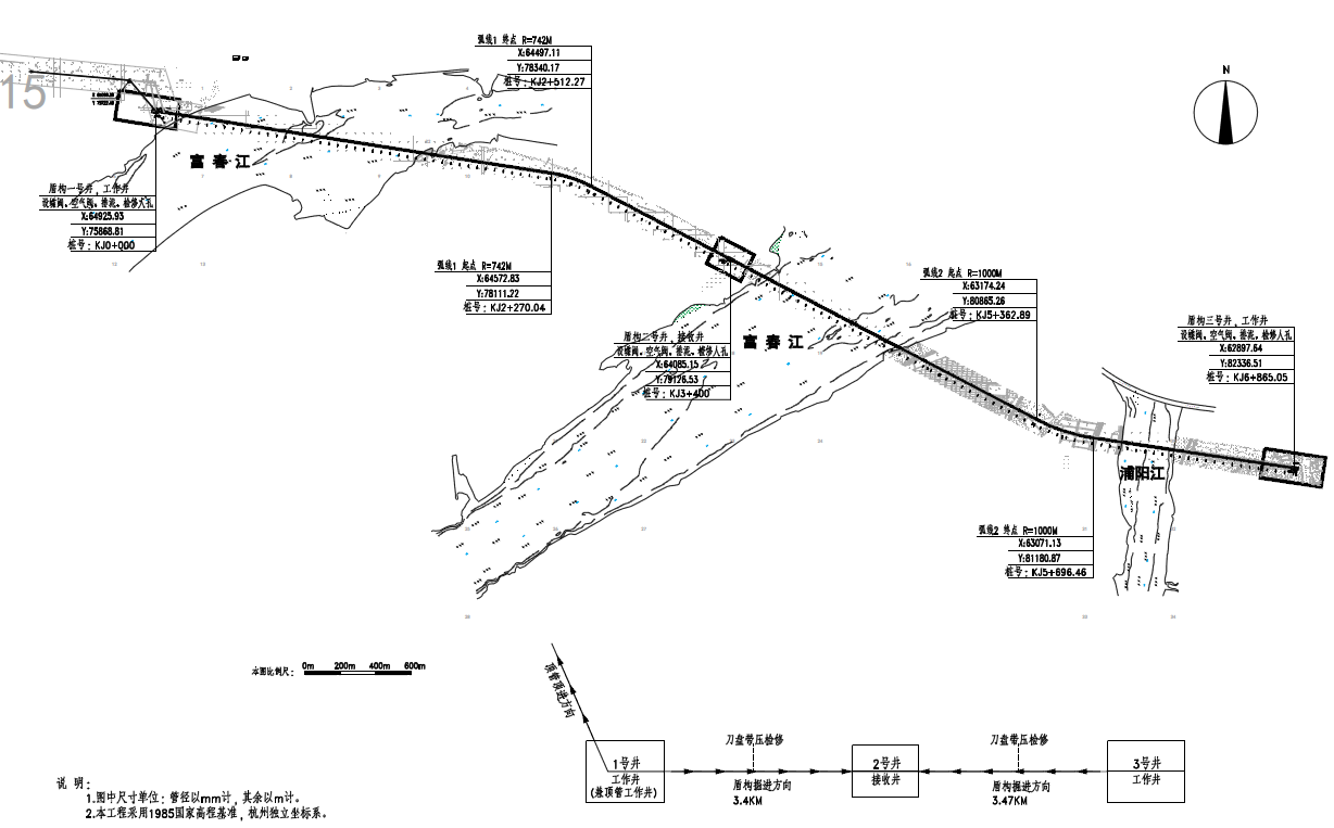 本標段為江南線輸水線路雙浦節點至漁浦的過江段,線路長約6.87km,要求采用盾構法及明挖法施工,其中接收井和工作井明挖法施工,盾構法施工段長約6.808km,管片襯砌段長約6.808km,管片外徑6.2m,管片厚0.35m;管片內襯鋼管直徑3.6m。過江段共設置3個盾構工作井,其中1#、3#工作井為盾構始發井,分別位于過江段起點(雙鋪龍池穿江點),終點(魚浦節點),2號工作井位于長安沙島東北角,為盾構接收井。工作井均采用地下連續墻施工工法。過江段兩次穿越富春江,一次穿越浦陽江,六次穿越河道堤防,設計為一類工程。