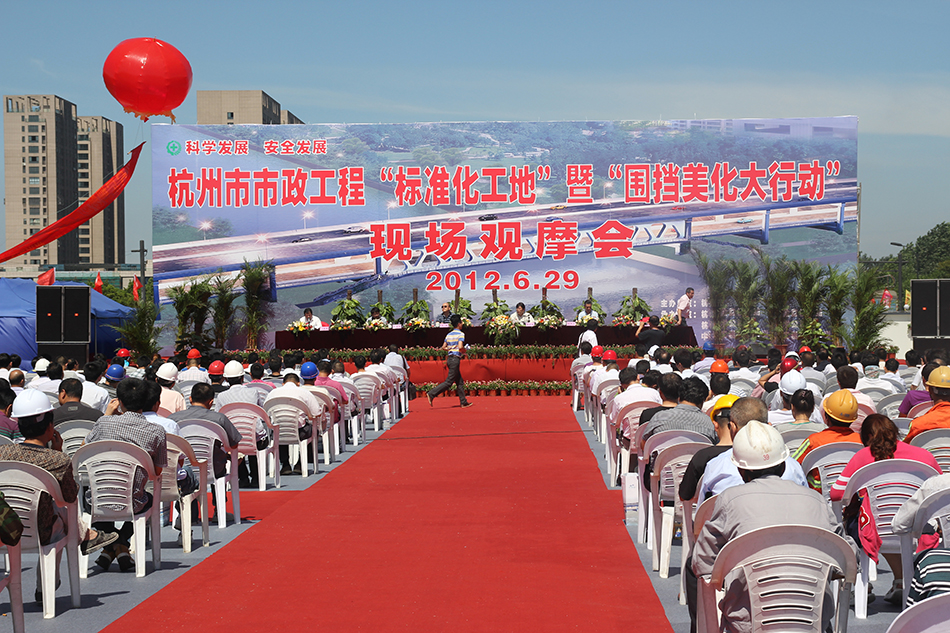 2012629日,杭州市市政工程“標準化工地”暨“圍擋美化大行動”現場觀摩會在杭州德勝東路改造提升工程02標工地如約召開。這次觀摩會,是全國安全生產月活動深入開展,杭州市建委大力彰顯“科學發展,安全發展”的鮮明主題情況下召開的,也是今年上半年杭州市建委首次召開大規模的觀摩會。市委副書記楊戎標和市建委副主任裘新谷為現場觀摩會致辭。